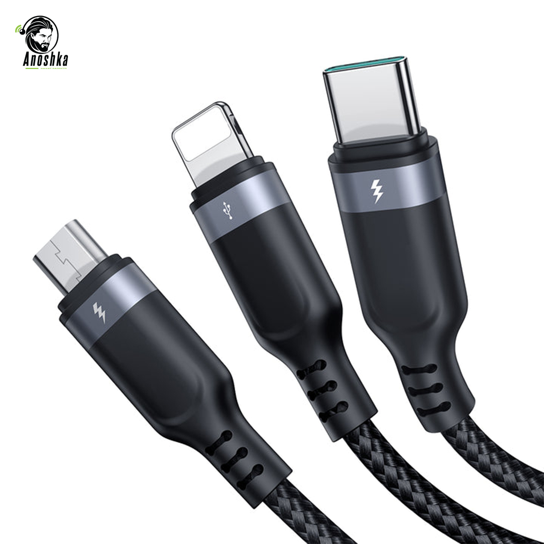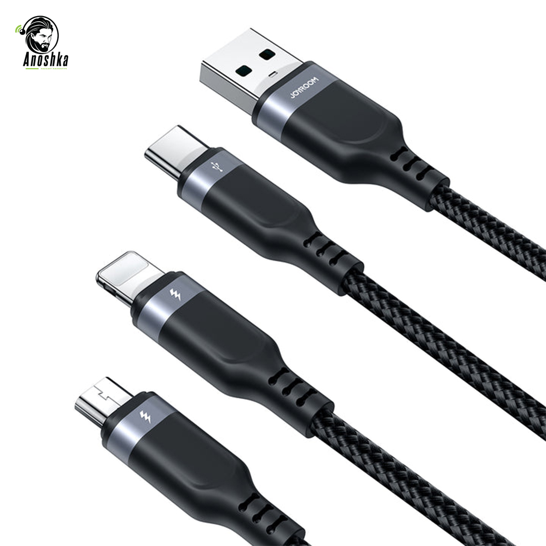 The JOYROOM S-A18 3-in-1 Data Cable features Lightning, Type-C, and Micro USB connectors, offering fast charging and data transfer in one durable, braided cable.