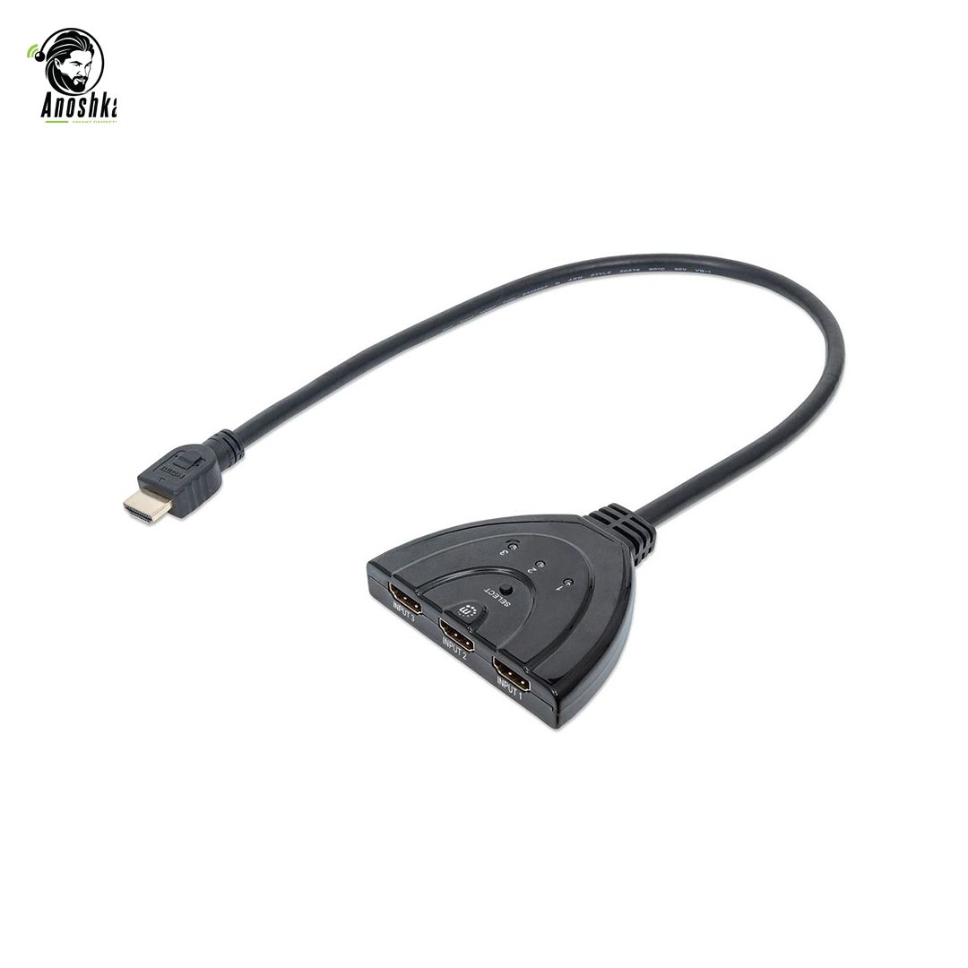 3-port HDMI switch with integrated cable supporting Full HD 1080p for easy switching between multiple HDMI devices.
