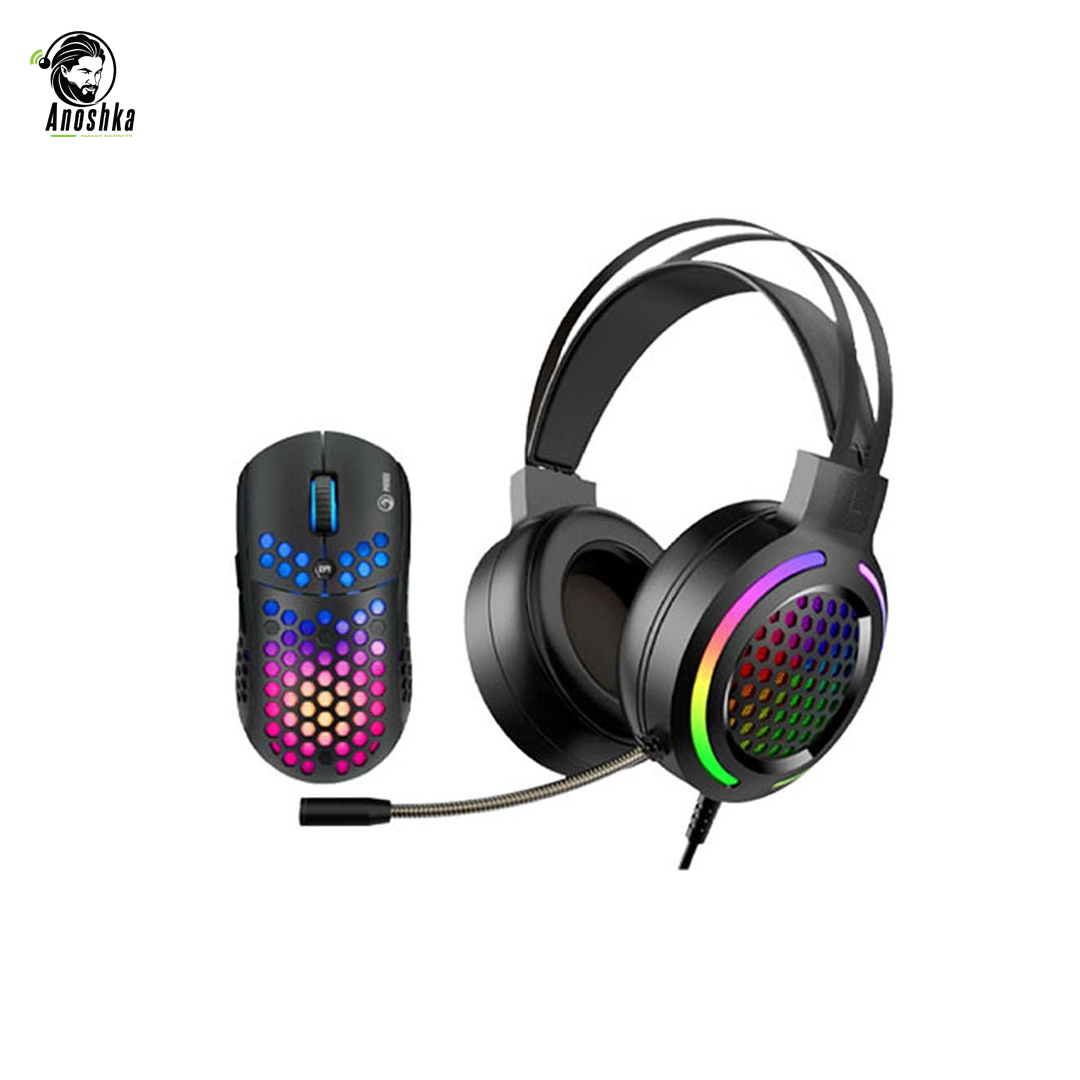 Complete gaming set with headset and mouse, offering clear sound, comfort, and precision control.