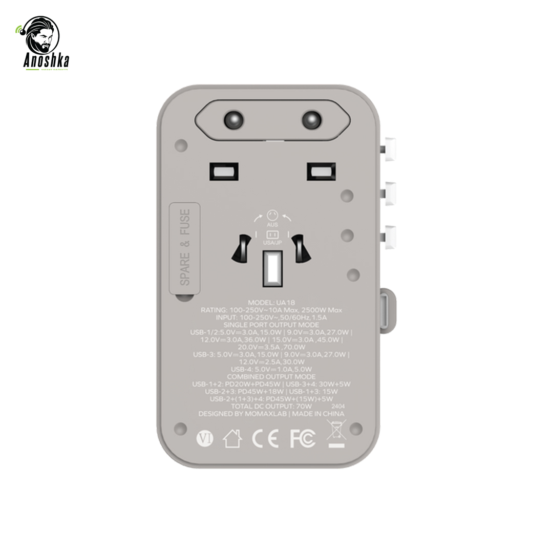 The MOMAX 1-World+ 70W β UA18E is your all-in-one power solutionβfast, universal, and reliable, designed to keep you connected anywhere in the world.