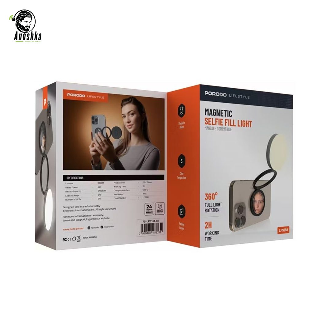 The Porodo Lifestyle 360° Rotatable Foldable Magnetic Flip is a versatile beauty accessory designed for selfies, makeup, and personal grooming. Featuring a compact mirror with 180° adjustable tricolor fill light, it provides soft and natural illumination for perfect lighting in any environment. Its 360° rotatable and foldable design allows flexible positioning and easy storage, while the magnetic suction ensures secure attachment to smartphones, desks, or other surfaces. Ideal for home, travel, or on-the-go makeup touch-ups.