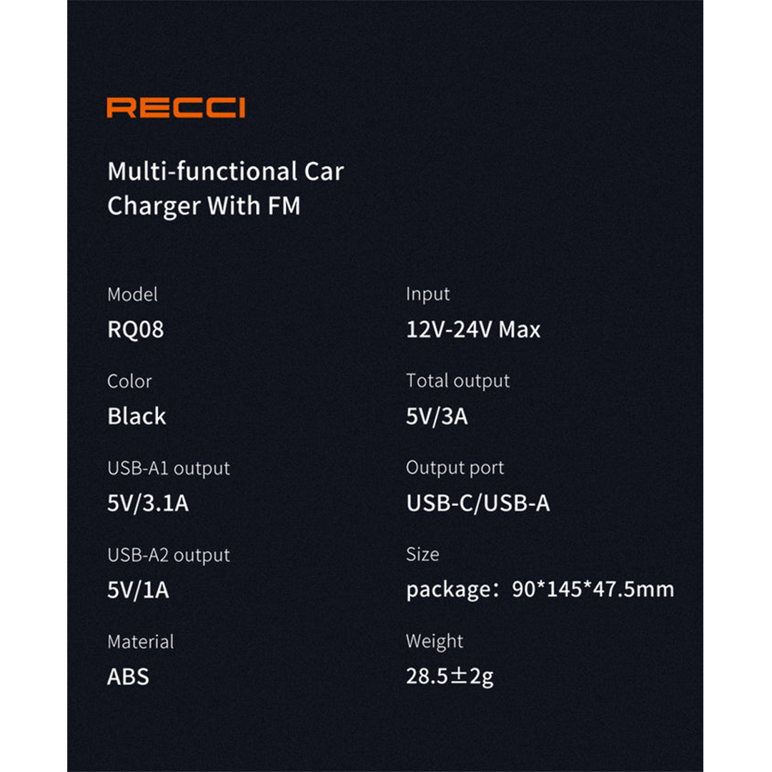 Stay powered up on the road with the RECCI Car Charger RQ08, a sleek and powerful charging solution designed to deliver reliable energy wherever you go. Built for modern drivers, it combines fast dual-port charging, advanced safety features, and a durable metallic design β ensuring your devices never run out of power while youβre on the move.